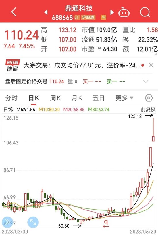 赓续前一往翌日“20CM”涨停后,6月20日早盘,鼎通科技再次波及涨停板并创出历史新高。但随后股价回落,最终收报110.24元/股,高涨7.45%。