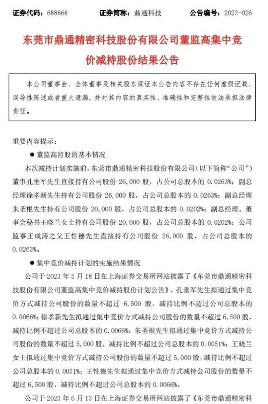 6月14日晚间,鼎通科技再次发布公告,公司于近日收到董事孔垂军,副总司理徐孝新、朱圣根,董事会布告、副总司理王晓兰等东说念主的减捏情况见告函。