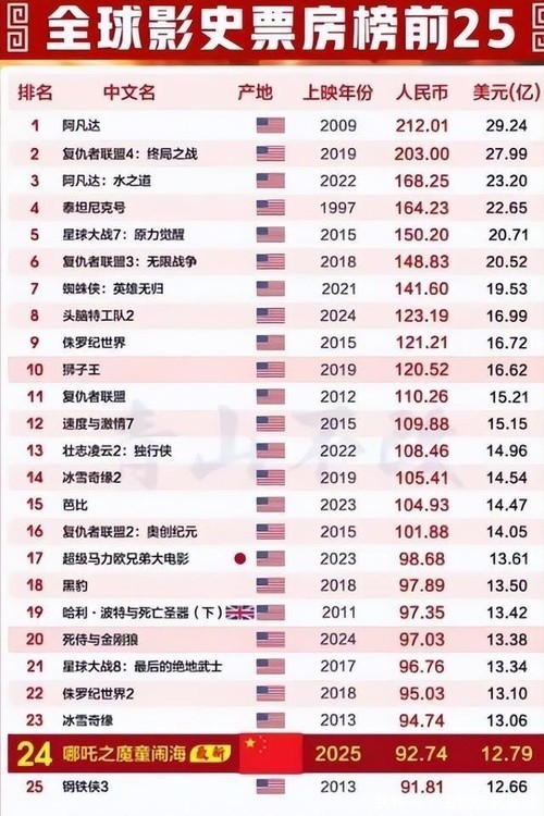 北好意思商场的不简陋看成可不啻这些。最近有预防的网友发现,在国际票房统计平台Box Office Mojo上,《哪吒2》果然消散了。猫眼平台上公共榜单清澄理解,《哪吒2》的得益一目了然,可到了北好意思这个平台就被径直辞退了。2025年的票房统计里,北好意思把《好意思国队长4》排第一,计较票房的时刻把公共票房皆算上了,连中国商场的1000万好意思元票房皆没放过。可在《好意思国队长4》底下是列邦本年上映的影片,唯有不见《哪吒2》。若是说因为《哪吒2》不是在好意思国全境上映就不骄贵,这根天职歧原理。望望公共排名榜,排在首位的是《阿凡达》,原来属于《哪吒2》的第6名位置却被早就被超过的《复仇者定约3》占了,这时刻再说没统计到,险些是离奇乖癖。